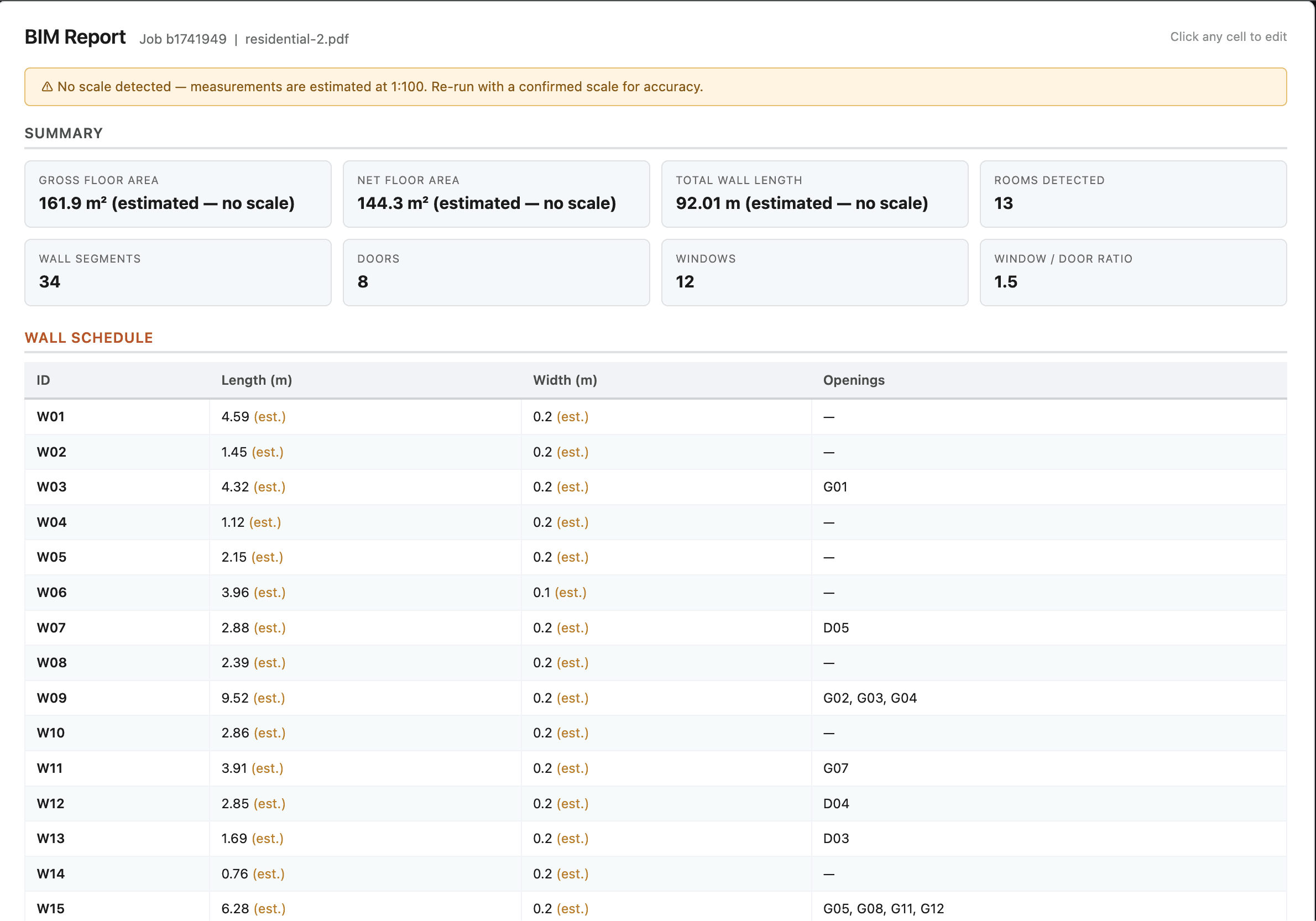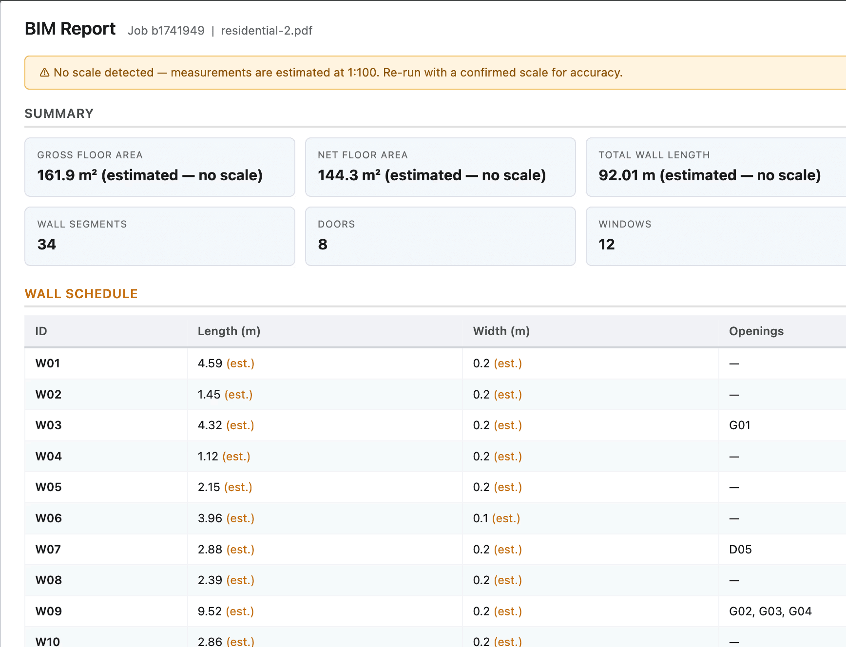 A clean PDF and CSV — walls, doors, windows, and spaces, each with IDs and measurements. Drop it into your estimate or BOQ, no reformatting.
